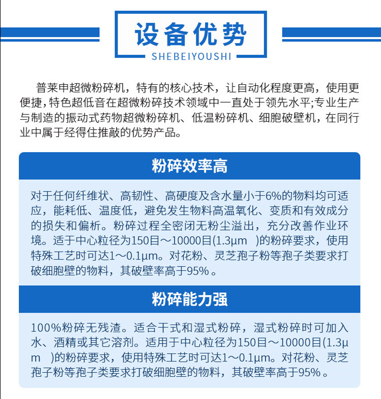 普莱申超微粉碎机,特有的核心技术,让自动化程度更高,使用更便捷,特色超低音在超微粉碎技术领域中一直处于领先水平;专业生产与制造的振动式药物超微粉碎机、低温粉碎机、细胞破壁机,在同行业中属于经得住推敲的优势产品。