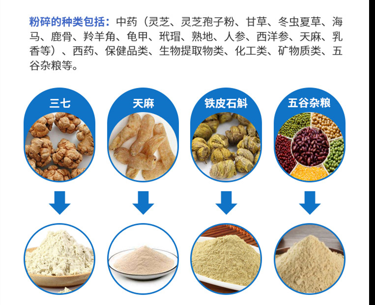 此设备有很多优势,一是粉碎效率高。对于任何纤维状、高韧性、高硬度及含水量小于6%的物料均可适应,能耗低、温度低,避免发生物料高温氧化、变质和有效成分的损失和偏析。粉碎过程全密闭无粉尘溢出,充分改善作业环境。适于中心粒径为150目〜10000目(1.3μm)的粉碎要求,使用特殊工艺时可达1〜0.1μm 。对花粉、灵芝孢子粉等孢子类要求打破细胞壁的物料,其破壁率高于95%。二是粉碎能力强。100%粉碎无残渣。适合干式和湿式粉碎,湿式粉碎时可加入水、酒精或其它溶剂。