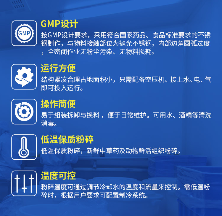2.易拆卸(组装)、易清洗、易换料。可用水、压缩空气、酒精、蒸汽等清洗、消毒。■粉碎过程全密闭无粉尘溢出,充分改善作业环境,粉碎物料及其有效成份不损失。